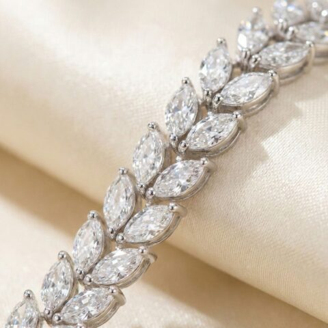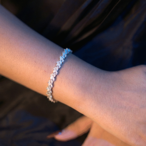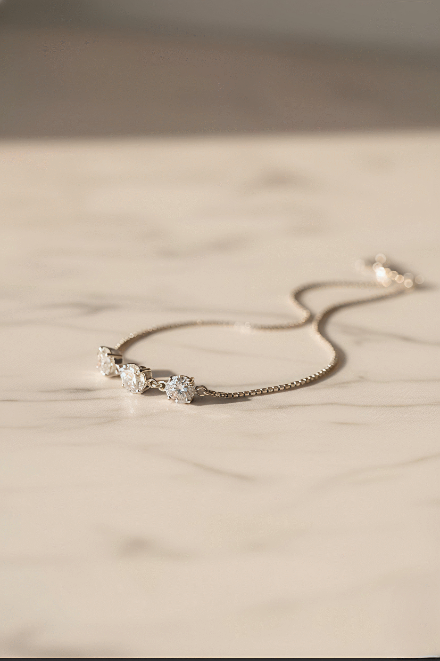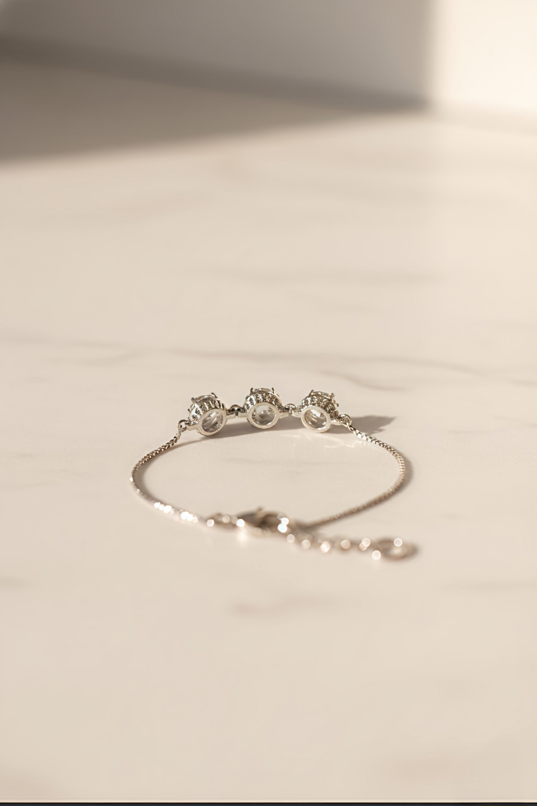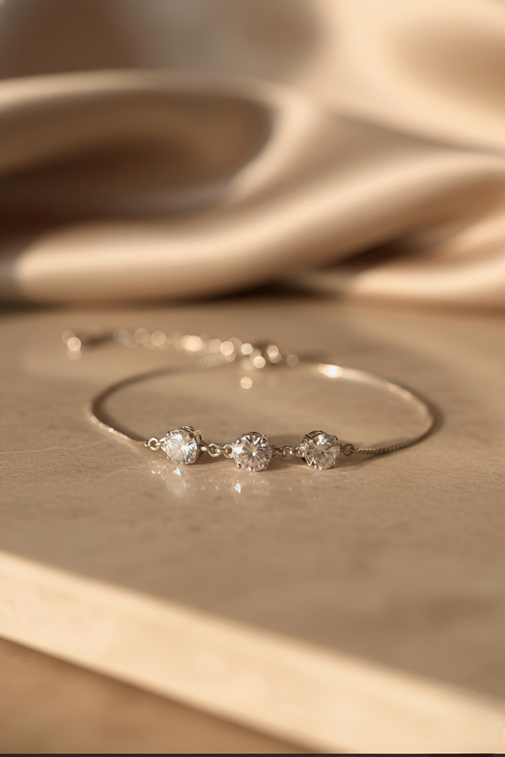 A sleek silver bracelet adorned with three dazzling stones. Perfect for adding effortless elegance to any outfit.