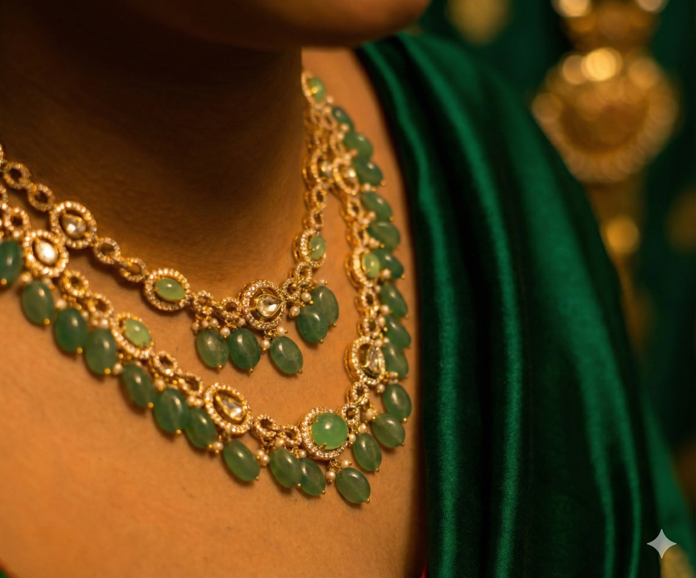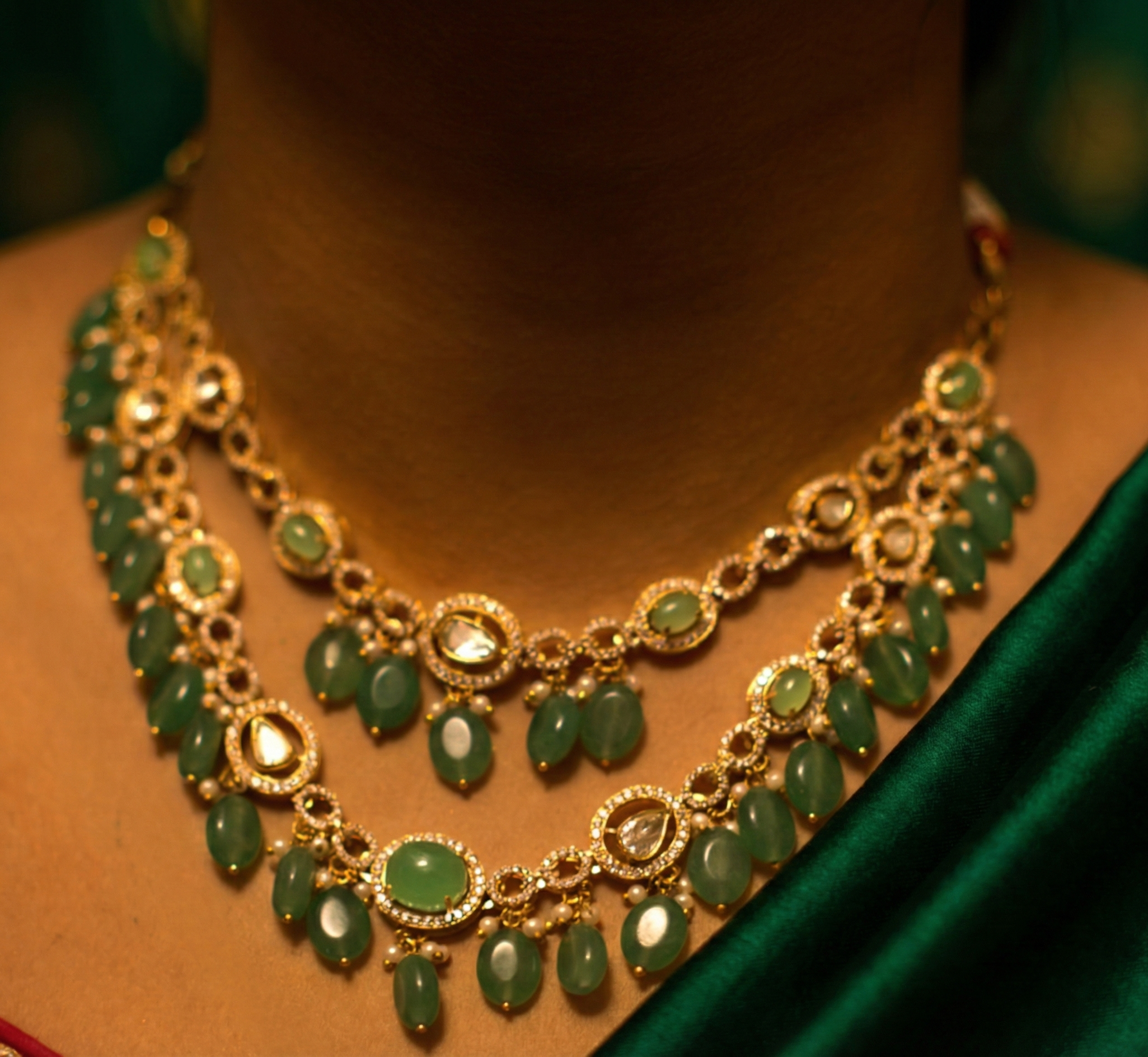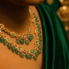 A premium gold-tone heavy necklace crafted with high-grade Swarovski stones and elegant emerald drop detailing. The piece is finished with a rhodium protective coat to prevent tarnish and maintain long-lasting shine.