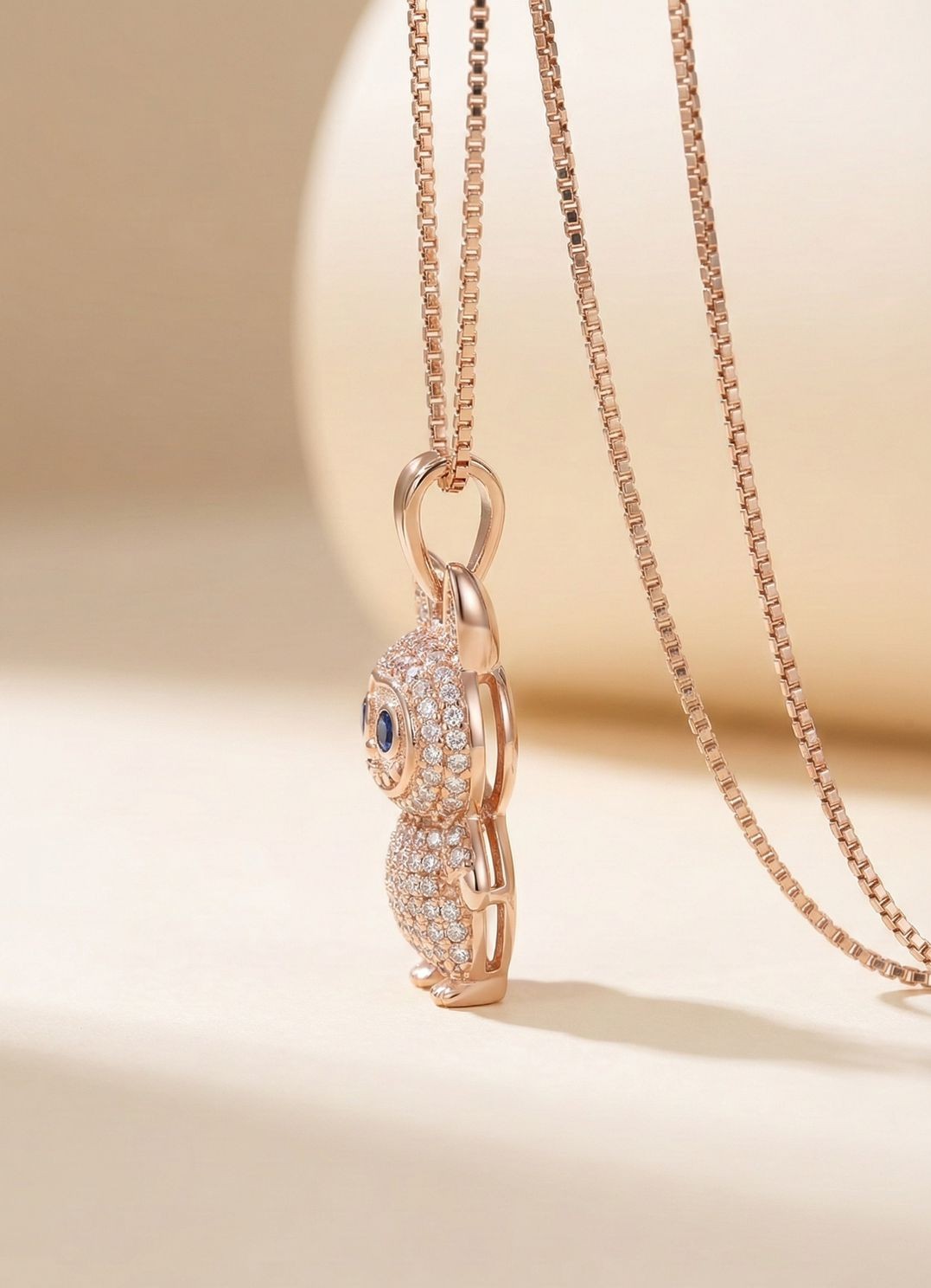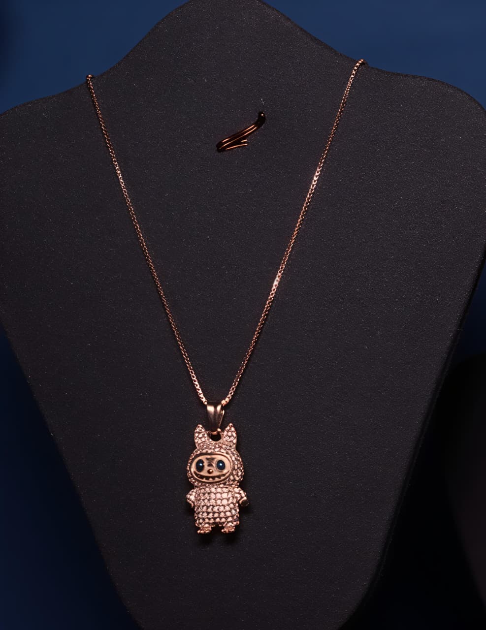 Made with a warm, rose-gold–tone finish and paired with a sleek matching chain, this pendant is perfect for everyday wear or as a standout accessory for special occasions. Whether you’re a collector, a fashion lover, or someone who adores whimsical jewelry, this piece is sure to make a delightful statement.